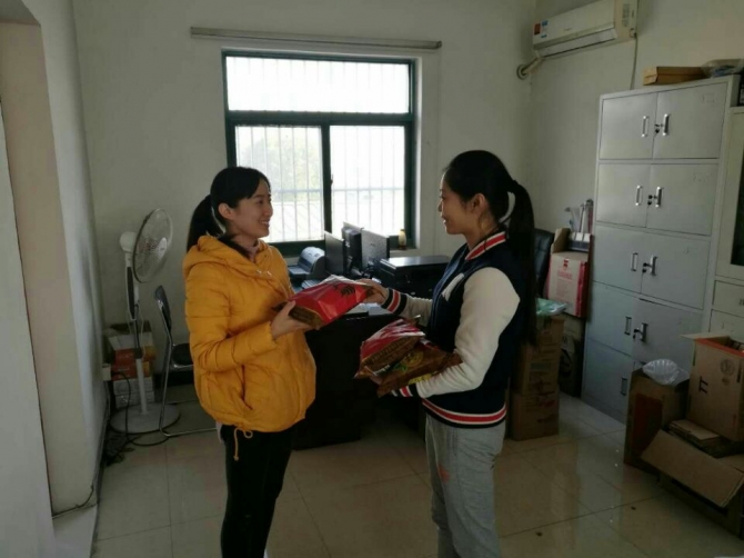 辦公室人員給保潔人員派發(fā)福利!