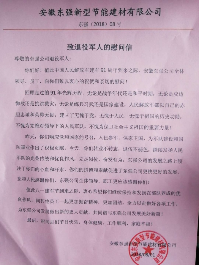 今天迎來中國人民解放軍建軍91周年,安徽東強(qiáng)公司全體領(lǐng)導(dǎo)、員工,向祖國最親愛的子弟兵致以衷心的祝福,同時向公司退伍軍人表達(dá)親切的慰問。